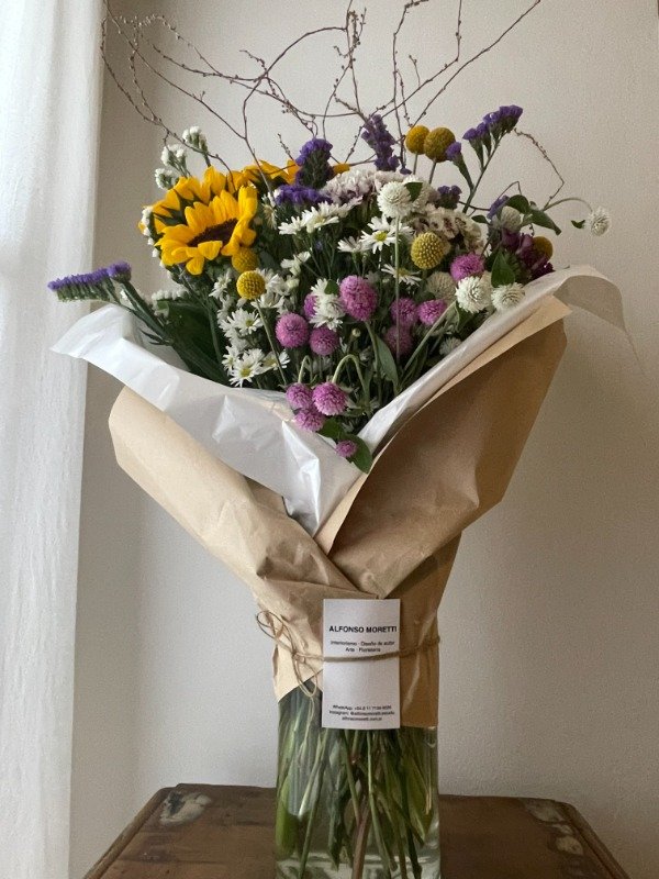 Un arreglo floral que combina frescura, movimiento y naturalidad, creado bajo un enfoque artístico y botánico. Este ramo reúne flores de temporada seleccionadas —como girasoles, siemprevivas, craspedias, asters y statice— armonizadas con ramas secas que aportan altura y gesto escultórico.